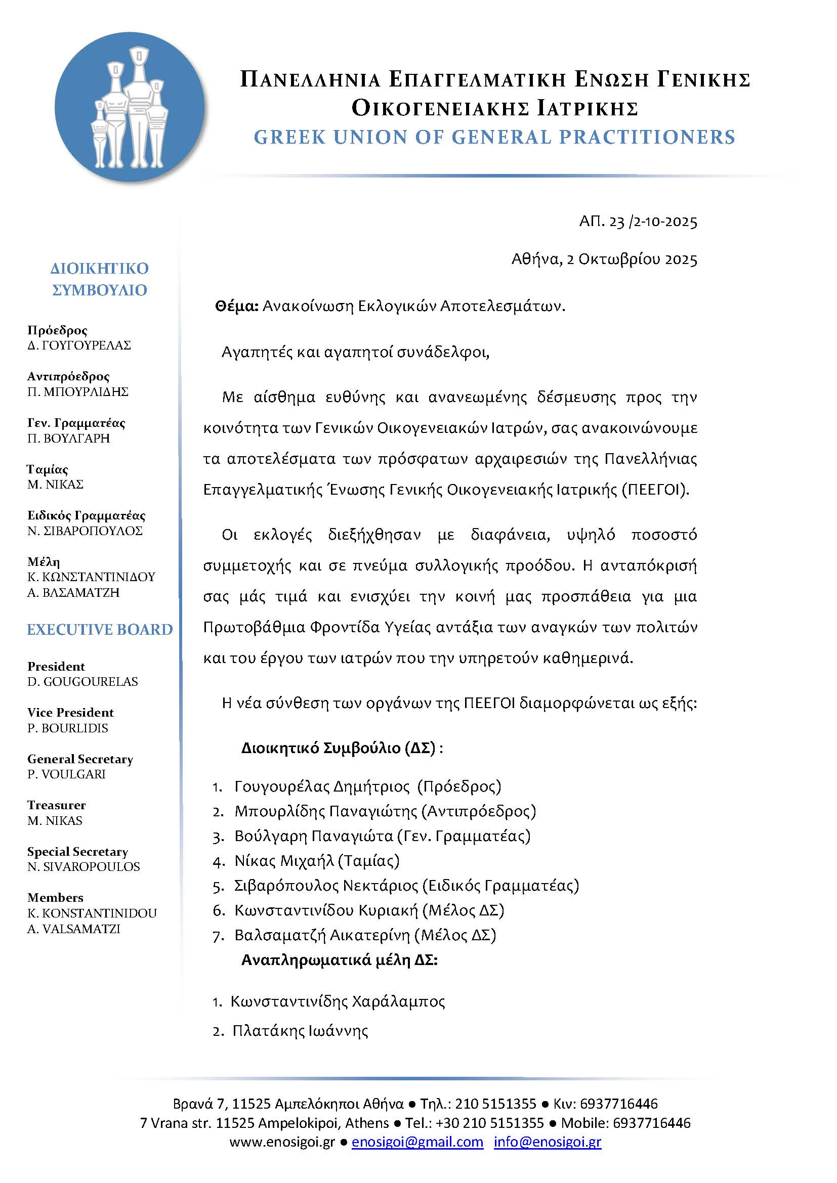 Με αίσθημα ευθύνης και ανανεωμένης δέσμευσης προς την κοινότητα των Γενικών Οικογενειακών Ιατρών, σας ανακοινώνουμε τα αποτελέσματα των πρόσφατων αρχαιρεσιών της Πανελλήνιας Επαγγελματικής Ένωσης Γενικής Οικογενειακής Ιατρικής (ΠΕΕΓΟΙ).